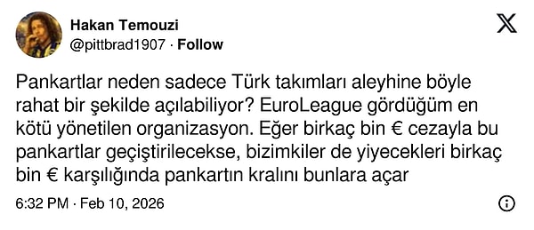 'Pankartlar neden sadece Türk takımları aleyhine böyle rahat bir şekilde açılabiliyor? EuroLeague gördüğüm en kötü yönetilen organizasyon. Eğer birkaç bin € cezayla bu pankartlar geçiştirilecekse, bizimkiler de yiyecekleri birkaç bin € karşılığında pankartın kralını bunlara açar.'