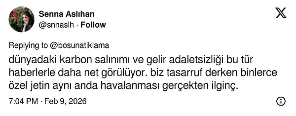 Özel jetler, ticari uçaklara kıyasla yolcu başına 5 ila 14 kat daha fazla karbon emisyonu üreterek ulaşım araçları arasında çevreye en çok zarar veren seçeneklerin başında geliyor. Öyle ki, bir özel jetin sadece bir saatlik uçuşu, ortalama bir insanın yıllık karbon ayak izinin yarısına denk gelen yaklaşık 2 ton CO2​ salınımına neden oluyor. Kısa mesafeli rotalarda kalkış için harcanan aşırı yakıt, uçuşların %40’a yakınının yolcusuz yapılması ve yüksek irtifada salınan azot oksitler ile su buharının yarattığı sera etkisi, bu araçları iklim krizi açısından oldukça verimsiz ve maliyetli bir 'lüks' haline getiriyor.
