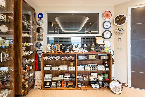 1990 yılından bu yana topladığı saatleri önceleri üç raflı