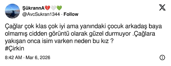 Yeni sezonun merak edilen yapımlarından Çirkin dizisi sosyal medyada gündem oldu. Dizinin başrollerini paylaşan Çağlar Ertuğrul ile Derya Pınar Ak arasındaki yaş farkı dikkat çekti. 38 yaşındaki Ertuğrul ile 22 yaşındaki Ak’ın dizide iki çocukluk arkadaşını canlandıracakları iddia edilince ortalık karıştı.