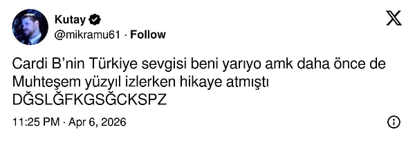 Özellikle Muhteşem Yüzyıl dizisine olan ilgisiyle dikkat çeken Cardi B, Hürrem Sultan karakterine duyduğu hayranlığı açıkça dile getirmişti. Sosyal medya paylaşımlarında diziye dair yorumlar yapan rapçi, Türk izleyicilerin de radarına girmişti.