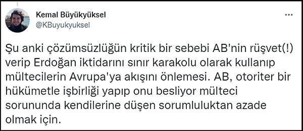 Sorunun çözümü için Avrupa Birliği ile yapılan anlaşmaların iptal edilmesini önerenler de var: "Şu anki çözümsüzlüğün kritik sebebi AB'nin rüşvet verip Erdoğan iktidarını sınır karakolu olarak kullanması"👇