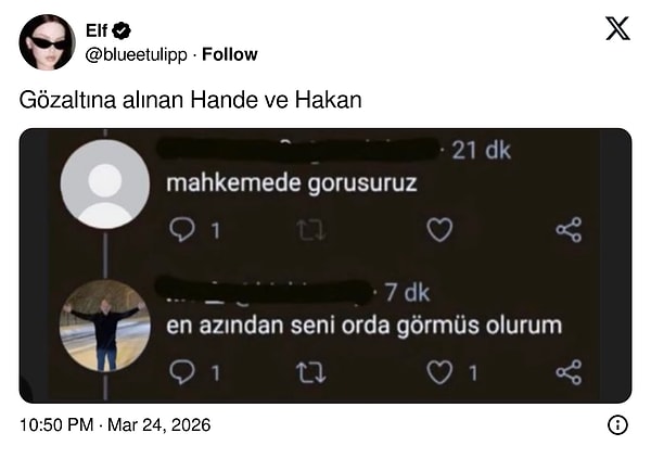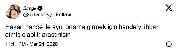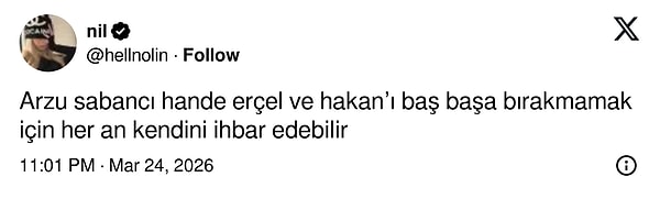 Sosyal medyada yapılan “Arzu Sabancı, Hande Erçel ve Hakan’ı baş başa bırakmamak için kendini ihbar edebilir” şeklindeki yorumlar dikkat çekti.