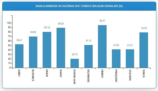 İstanbul Barajlarında doluluk oranı ise Istrancalar'da yüzde 20.15 Terkos'ta yüzde 78.78, Sazlıdere'de yüzde 41.21, Alibey'de yüzde 52.41, Büyükçekmece'de yüzde 69.96, Ömerli'de yüzde 95.37, Darlık'ta yüzde 80.18, Elmalı'da yüzde 89.29, Kazandere'de yüzde 51.12 ve Pabuçdere'de yüzde 41.03 olarak kaydedildi.