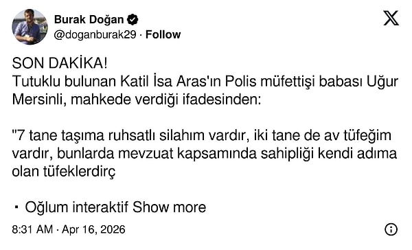Gazeteci Burak Doğan'ın haberine göre; saldırganın polis müfettişi babası Uğur Mersinli mahkemedeki ifadesinde şu sözleri kullandı: