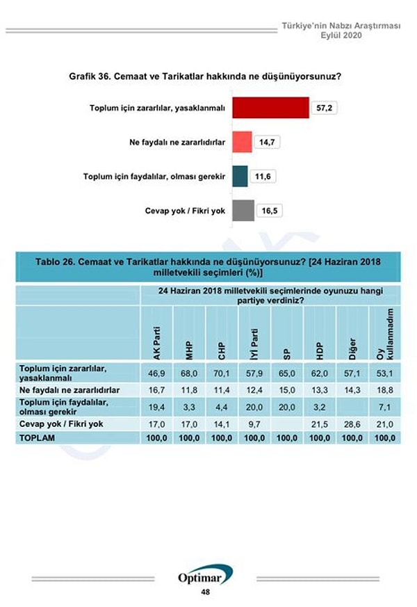 AKP'ye yakınlığıyla bilinen araştırma şirketi OPTİMAR’ın her ay yaptığı “Türkiye’nin Nabzı” araştırmasına göre toplumun çoğunluğu cemaat ve tarikatların zararlı olduğunu ve yasaklanması gerektiği görüşünde.