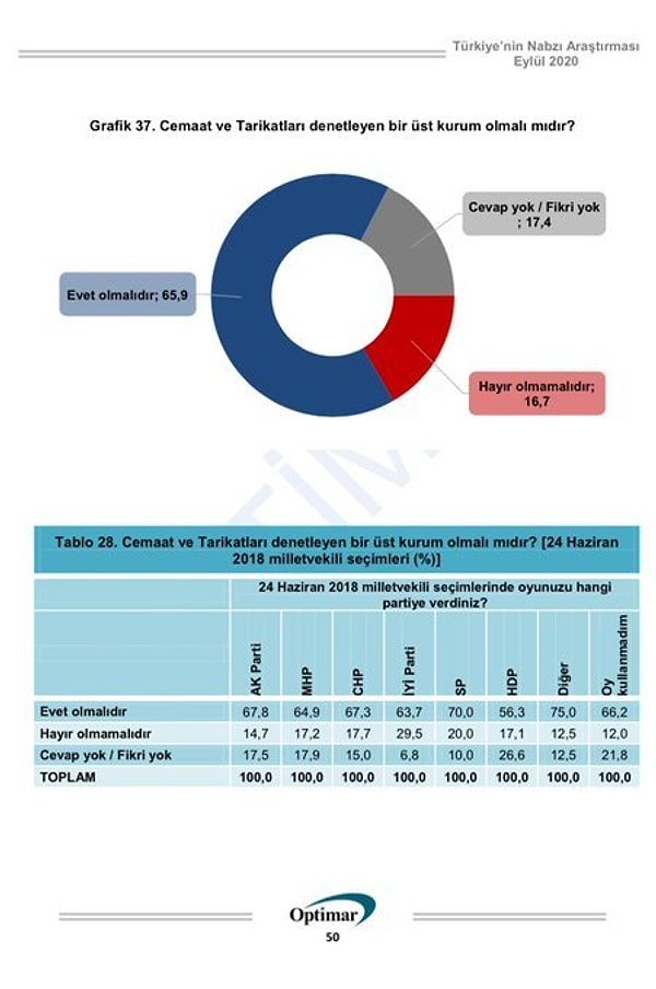 Ankette konuyla ilgili yöneltilen “cemaat ve tarikatları denetleyen bir kurum olmalı mı?” sorusuna yanıt veren yüzde 65.9’luk çoğunluğu “evet” yanıtını verdi. Bu soruyu ‘evet’ diyerek yanıtlayanlar arasında 24 Haziran seçimlerinde AKP’ye oy vermiş seçmenlerin oy oranının yüzde 67.8’lik bir seviyeyle CHP seçmenlerini (yüzde 67.3) geçmiş olması, araştırmanın çok dikkat çeken bir başka sonucu oldu.
