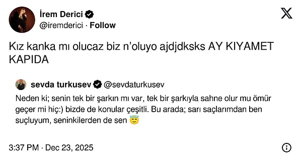 Türküsev'in kırk yılın başında makul bir açıklama yaptığını gören ve şaşıran İrem Derici'den Türküsev'e, 'Her Allah’ın günü bunu yaz, başka bir şey yazma ben razıyım sarı fırtınam' yorumu geldi.