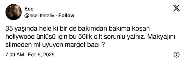 Hollywood’un en çok konuşulan yıldızlarından 35 yaşındaki Margot Robbie, bu kez rolüyle ya da kırmızı halı stiliyle değil, filtresiz bir karesiyle gündeme oturdu. Sosyal medyaya düşen fotoğraf kısa sürede viral olurken, yorumlar da ikiye bölündü.