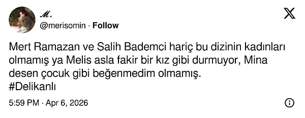 Mert Ramazan Demir, Mina Demirtaş, Salih Bademci ve Melis Sezen'in başrollerini paylaştığı Delikanlı sonunda başladı. Show TV'de izleyici karşısına çıkan dizinin ilk bölümünün reytingleri şimdiden merak edildi. Uzak Şehir'e rakip olan dizinin ilk bölümüne sosyal medyada yorum yağarken Mert Ramazan Demir ve Mina Demirtaş arasındaki yaş farkı yeniden gündem oldu.