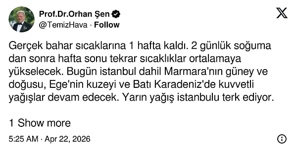 İşte Orhan Şen’in açıklaması: “Gerçek bahar sıcaklarına 1 hafta kaldı. 2 günlük soğuma dan sonra hafta sonu tekrar sıcaklıklar ortalamaya yükselecek. Bugün İstanbul dahil Marmara'nın güney ve doğusu, Ege'nin kuzeyi ve Batı Karadeniz'de kuvvetli yağışlar devam edecek. Yarın yağış istanbulu terk ediyor. 1 Mayıs dan itibaren özellikle İstanbul dahil batı bölgelerimizde sıcaklıklar artarak bahar değerlerinin üzerine çıkacak hatta yaz provası yapacak.”