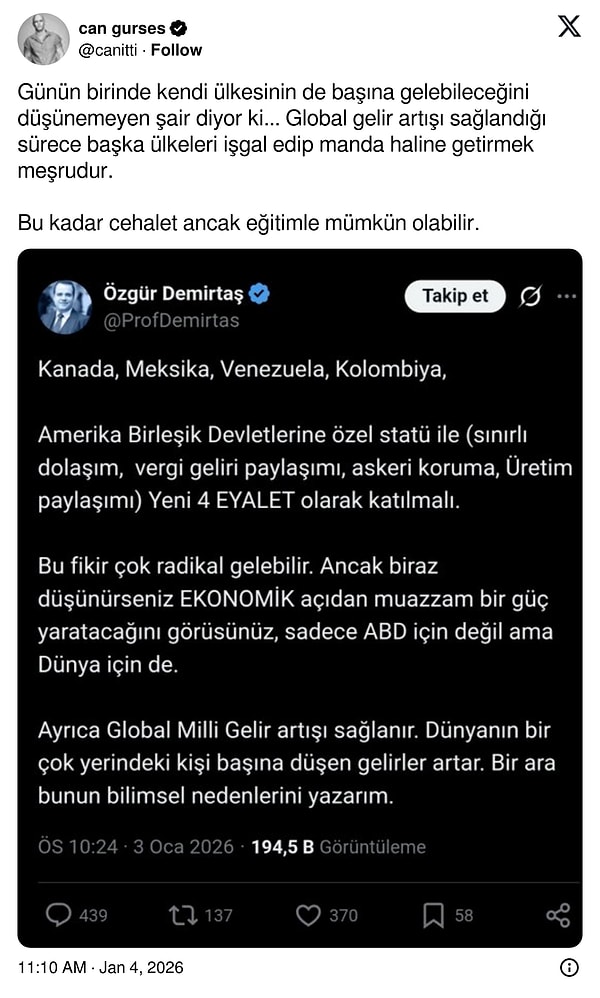 Genelde ekonomi paylaşımları ile konuşulan Özgür Demirtaş, gündeme bu sefer ABD-Venezuela özelinde yaptığı paylaşımla geldi. Özgür Demirtaş'ın X'te büyük tepki çeken paylaşımını silmesi, tepkileri dindirmek için yeterli olmadı. Birçok kişi ABD'nin gerçekleştirdiği yasa dışı saldırıyı kınarken, Demirtaş'ın bu konudaki yorumu büyük tepkilere yol açmaya devam ediyor.