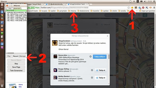 numaralı kısım da hazırladığımız kodun kaydedildiği yer. İmacros kalsörünün içinde. Demin RT edenleri takip ederek kodumuzu oluşturduk şimdi FAV yapanları açıyoruz ve üzerinde kodumuzu deniyoruz. Yer imlerindeki imacros klasörüne tıklayıp kodumuza tıklıyoruz ve hoooppp herkesi bir kerede takip ediyor. Kolay gelsin. Şimdi yapmanız gereken konseptinize uygun kişileri ve tweetleri bulup takip etmek.