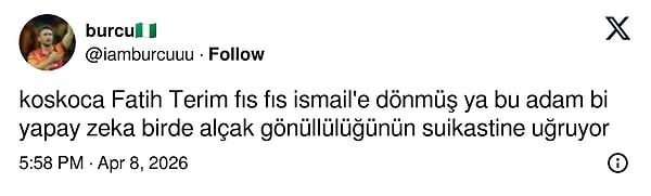 İşin “magazin” kısmı da tam olarak burada başladı! Fotoğraftaki açı, Fatih Terim’in yüz ifadesi ve kadrajın yarattığı garip perspektif sosyal medyada büyük bir goygoy dalgası başlattı. Kullanıcılar kareyi adeta didik didik etti; “tavşan”, “sincap” benzetmeleri havada uçuştu. Hatta bazıları işi bir tık ileri götürüp “koskoca Fatih Terim’i Fıs Fıs İsmail’e çevirmişler” yorumunu yaptı! Kısacası masum bir uçak selfie’si, bir anda sosyal medyanın en çok konuşulan karelerinden birine dönüştü... Ve Fatih Hoca durduk yere goygoyun ortasına düştü!