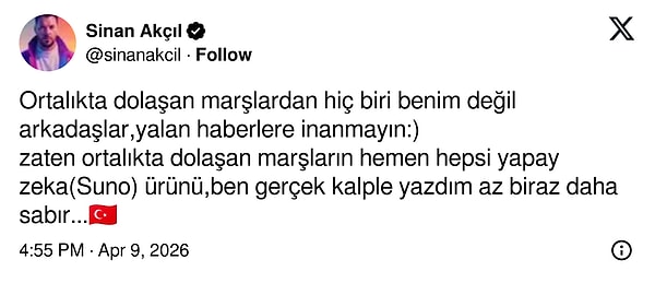 Sosyal medyada dolaşan birden çok mar hakkında ‘Onlar yapay zeka’ diyen Sinan Akçıl yeni marş yaptığını, duymamız için biraz daha beklememiz gerektiğini şu sözlerle açıkladı: “Ortalıkta dolaşan marşlardan hiç biri benim değil arkadaşlar, yalan haberlere inanmayın:) zaten ortalıkta dolaşan marşların hemen hepsi yapay zeka(Suno) ürünü, ben gerçek kalple yazdım az biraz daha sabır..