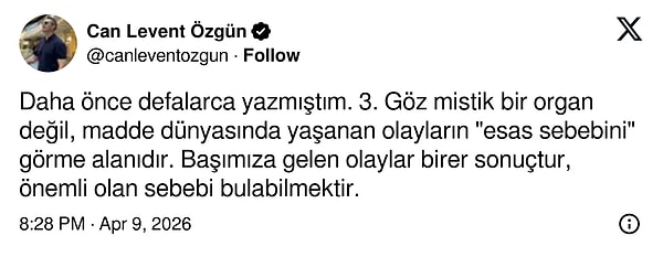 Daha önce defalarca yazmıştım. 3. Göz mistik bir organ değil, madde dünyasında yaşanan olayların 'esas sebebini' görme alanıdır. Başımıza gelen olaylar birer sonuçtur, önemli olan sebebi bulabilmektir.