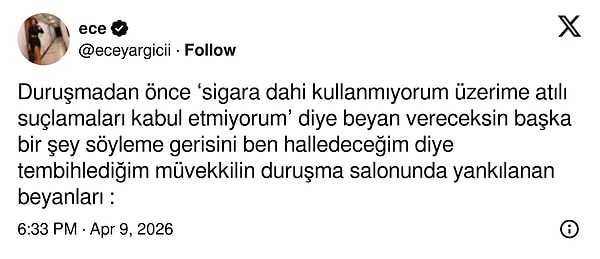 Duruşmadan önce ‘sigara dahi kullanmıyorum üzerime atılı suçlamaları kabul etmiyorum’ diye beyan vereceksin başka bir şey söyleme gerisini ben halledeceğim diye tembihlediğim müvekkilin duruşma salonunda yankılanan beyanları: